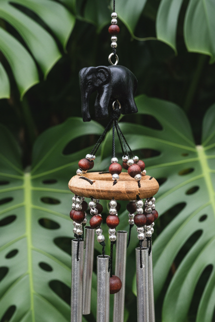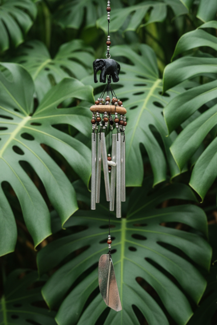 A lovely wind chime featuring a beautifully detailed black resin elephant, symbolising strength, wisdom, and good luck. As it gently sways in the breeze, it creates a soft, calming sound that brings a sense of peace and serenity to your space.