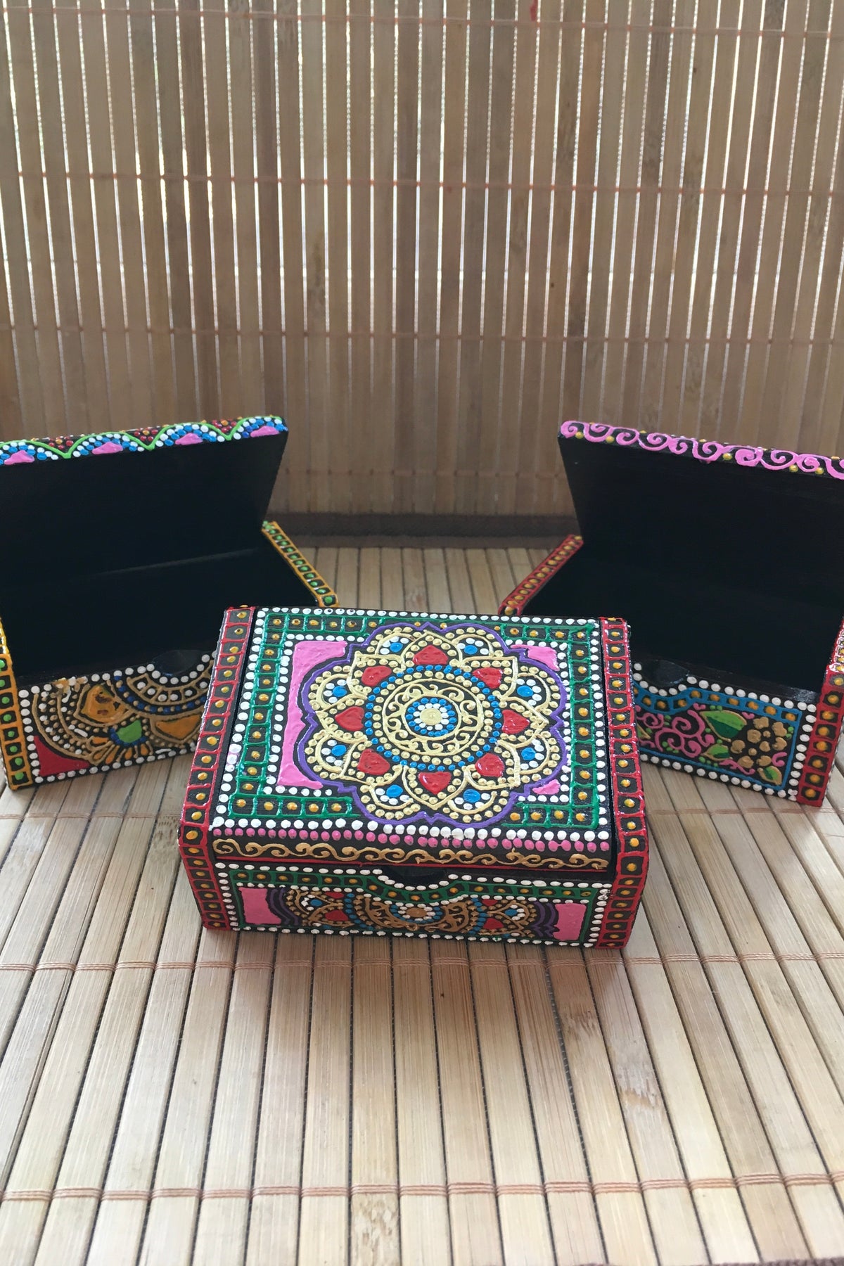 Gorgeous Hand Painted wooden boxes. The lid is hinged and opens easily.